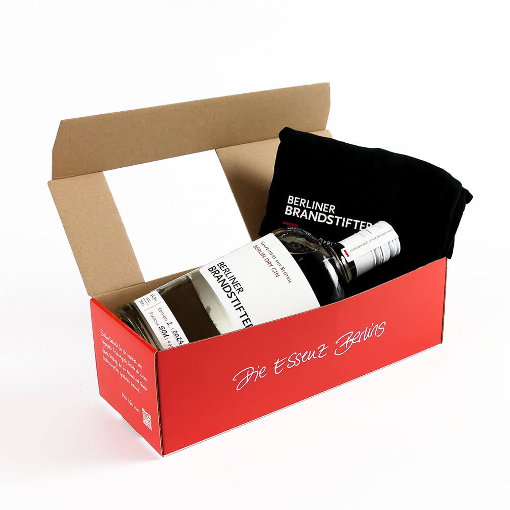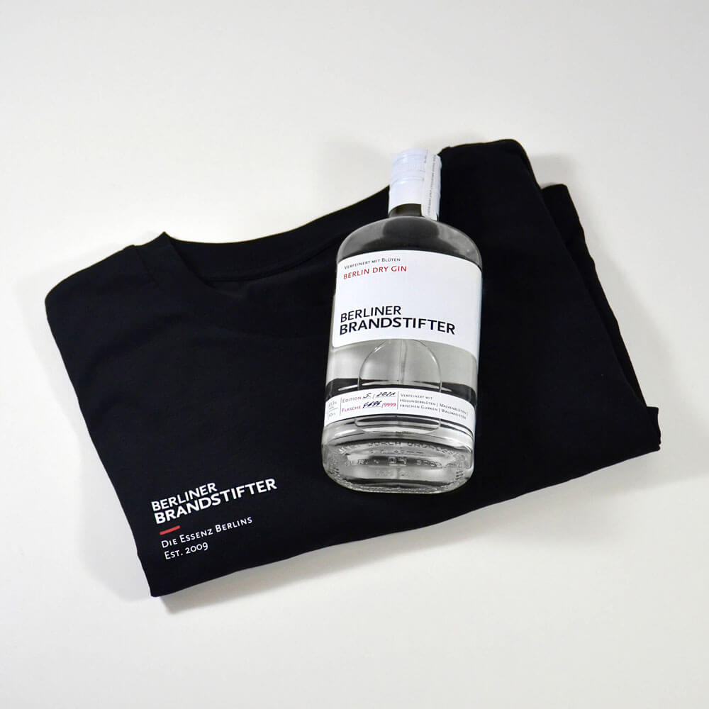 Dieses Style Set bestehend aus einer 0.7l Flasche Berlin Dry Gin und einem lässigen schwarzen Shirt lässt die Herzen von Gin und Fashion Fans höher schlagen.