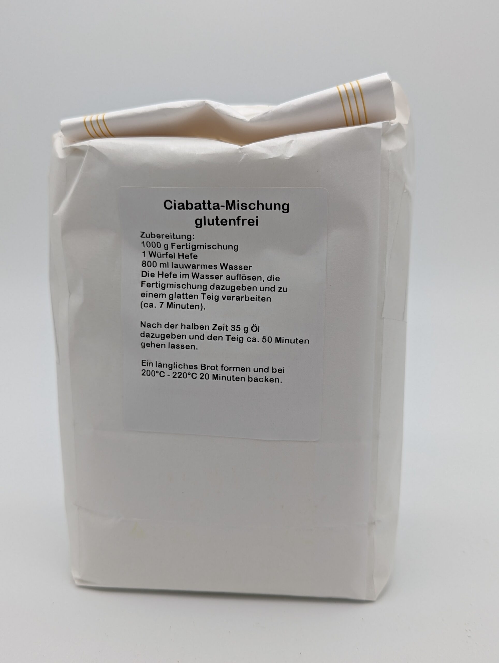 Zubereitung von Hand: 1000g Fertigmischung, 620 lauwarmes Wasser in eine Schüssel geben und zu einem glatten Teig verarbeiten. Den Teig abgedeckt ca. 60 Minuten gehen lassen und ein längliches Brot formen. Nun weitere 10 Minuten ruhen lassen. Währenddessen den Ofen auf 220 °C vorheizen. Das Brot nun 10 Minuten bei 220 °C und anschließend weitere 45 Minuten bei 220 °C backen. Die Gesamtbackzeit beträgt 55 Minuten.