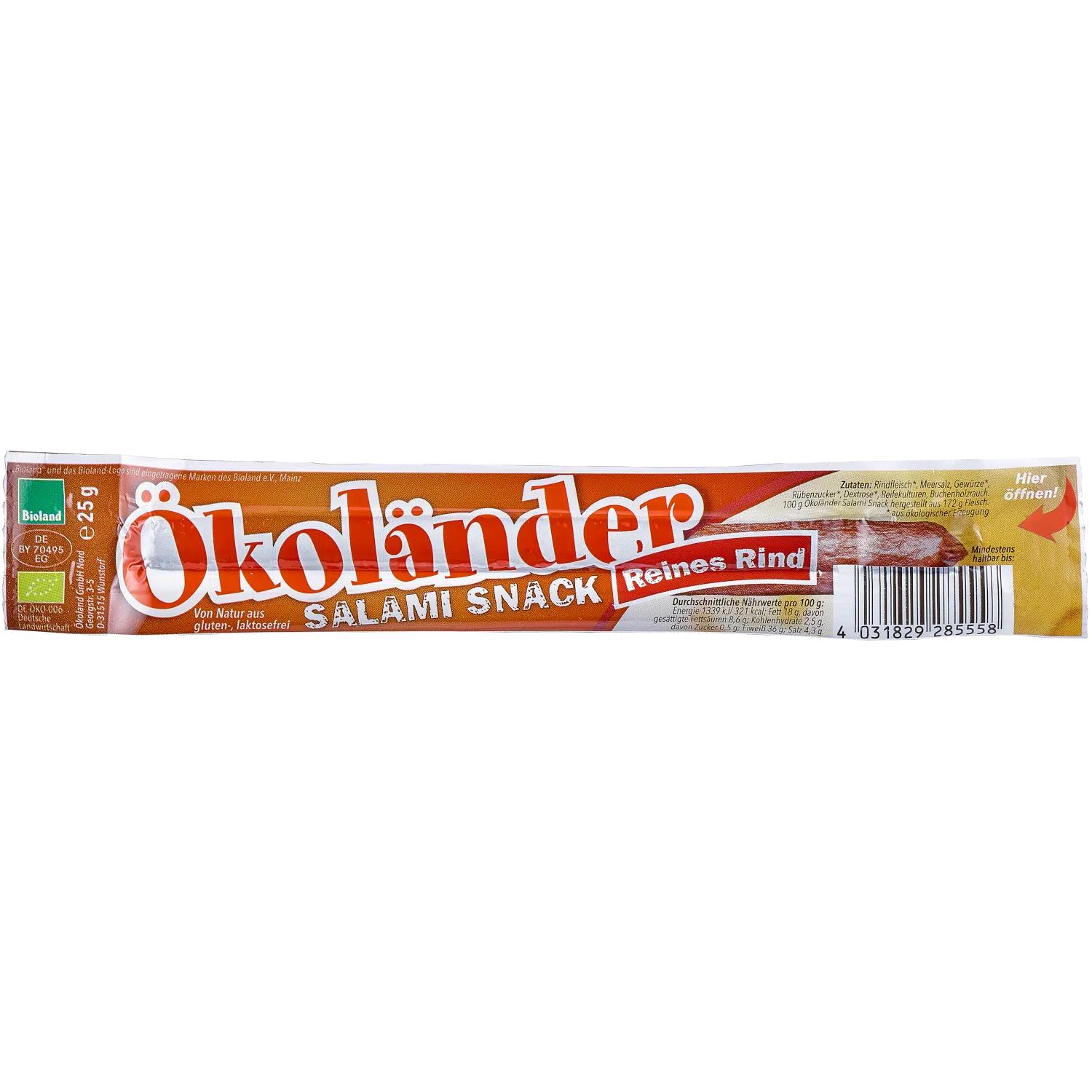 Die Salami Snacks von Ökoland werden im Naturreifeverfahren hergestellt, d.h. sie werden ohne Zugabe von Hilfsmitteln einer Lufttrocknung unterzogen und anschließend geräuchert. Die Variante aus reinem Bio-Rindfleisch ist mit 18% Fett eine relativ magere Alternative.