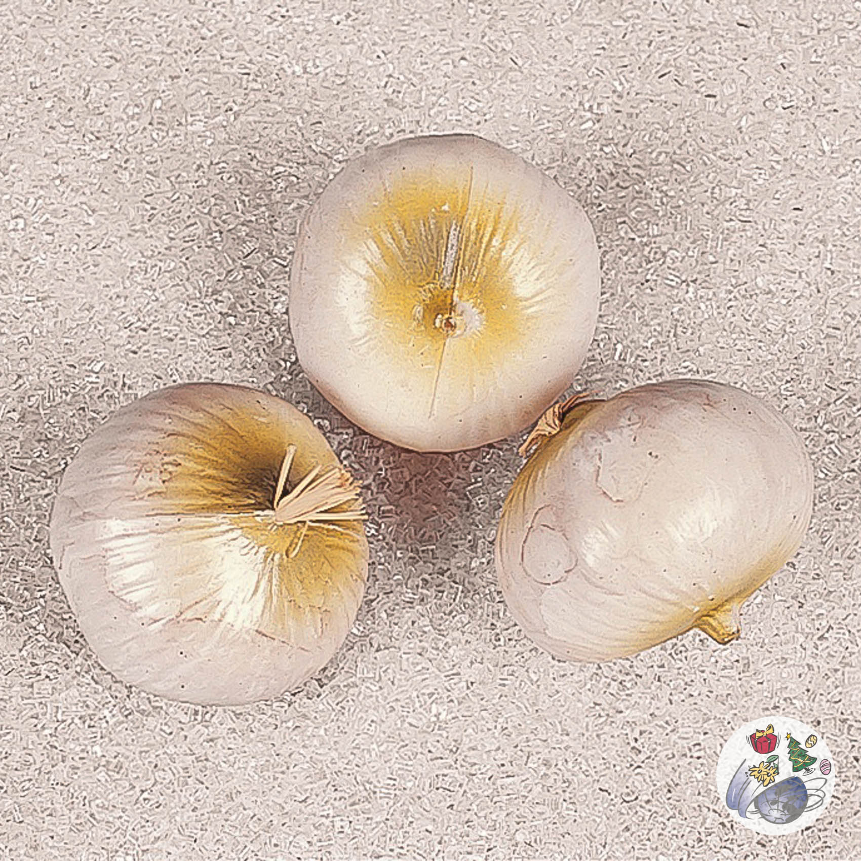 Drei weiße Deko-Zwiebeln, ideal für die Dekorationen zum Thema gesunde Ernährung. Preis für 3 Stück.