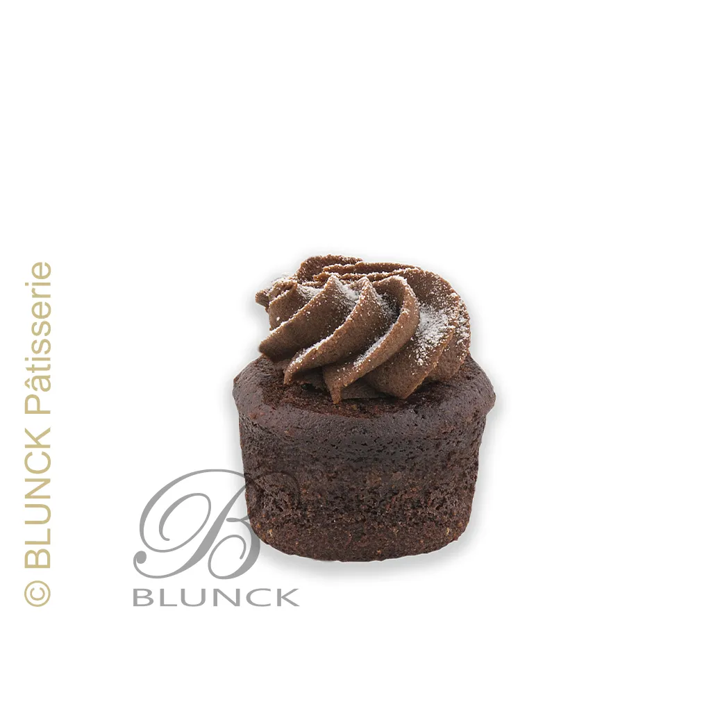 Saftiger Schokoladenkuchen, dekoriert mit einer Rosette aus einer Zartbitterkuvertüren-Mandelmilchcreme, bestreut mit feinem Dekorpuderzucker.