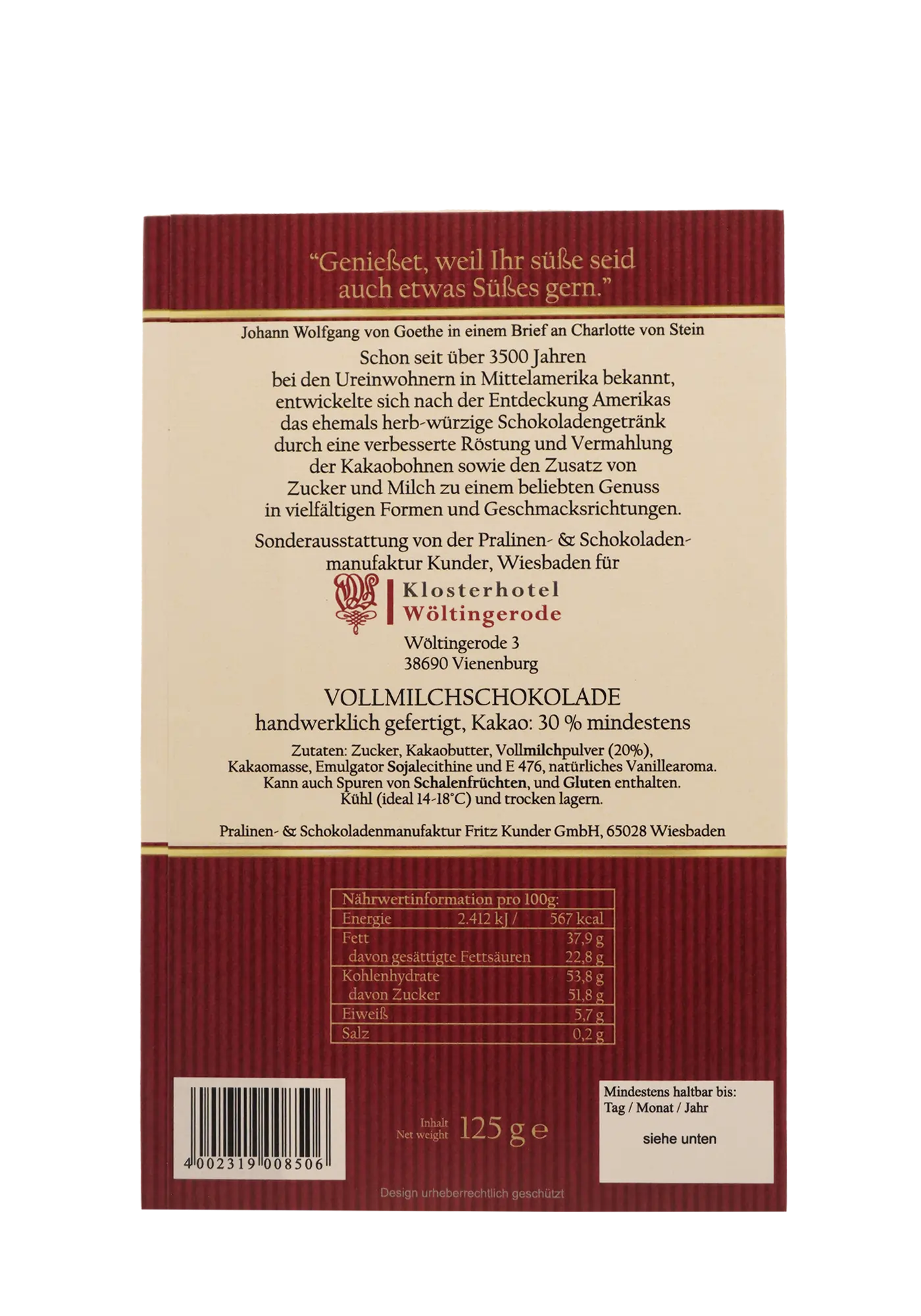 Süßer Gruß aus Wöltingerode – „Genießet, weil Ihr süße seid auch etwas Süßes gern.“ Johann Wolfgang von Goethe in einem Brief an Charlotte von Stein.